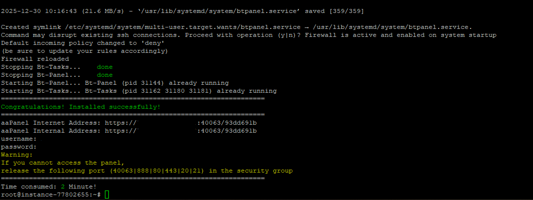Hãy lưu lại thông tin này ngay, vì aaPanel chỉ hiển thị một lần.