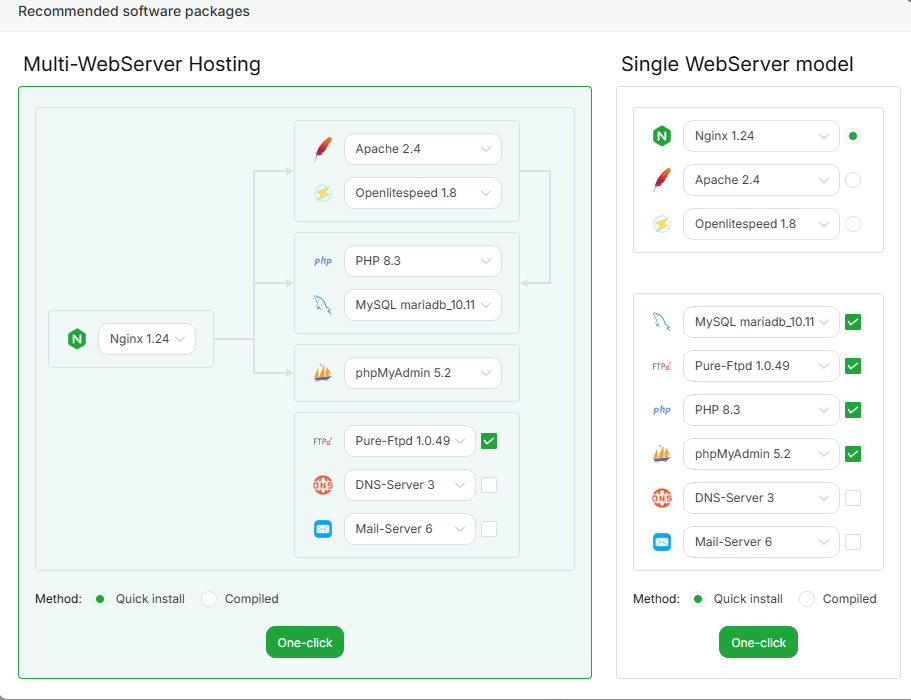 Nginx, Apache và OpenLiteSpeed có thể cài đặt và sử dụng linh hoạt.