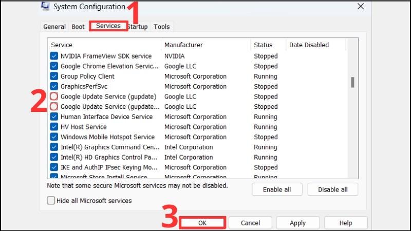 Bước 4: Tiếp theo, bạn cuộn xuống và tìm dịch vụ Google Update Service, bỏ chọn ô trước dịch vụ này. Rồi nhấp vào OK để lưu cài đặt và khởi động lại máy tính để áp dụng thay đổi.
