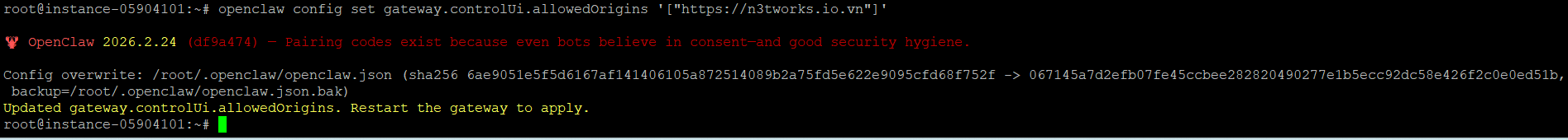 openclaw config set gateway.controlUi.allowedOrigins '["https://n3tworks.io.vn"]' (thay tên miền vào và chạy lệnh)